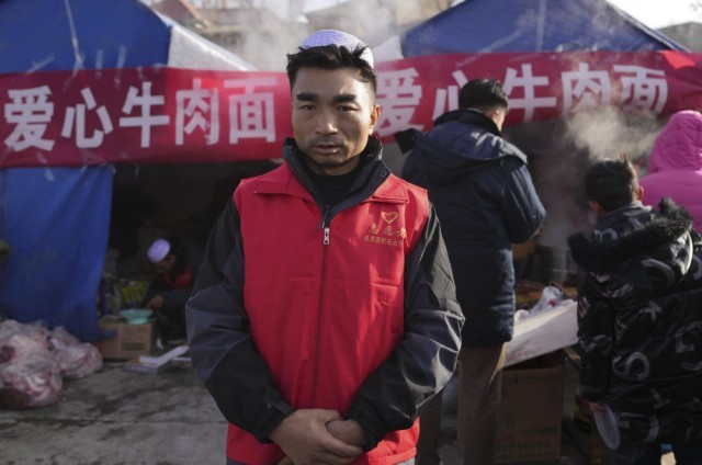 12月21日,36岁的兰州一餐饮企业老板马忠明在受灾群众临时安置点的爱心餐供应点。新华社记者陈斌摄