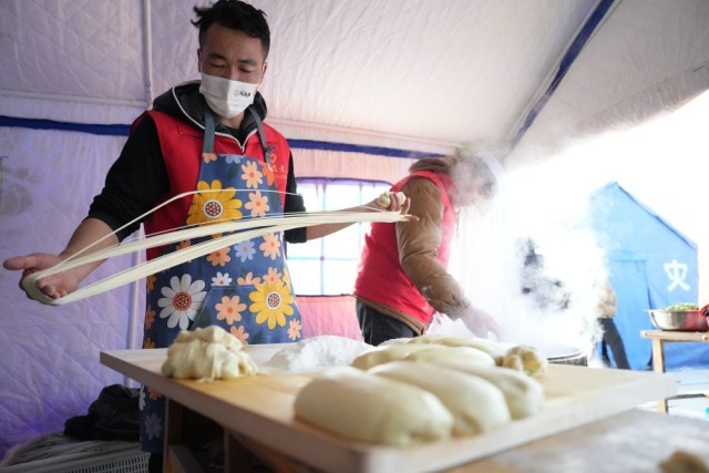 12月20日,在积石山县大河家镇大河村安置点,爱心企业的工作人员为受灾群众制作免费牛肉面。新华社记者陈斌摄