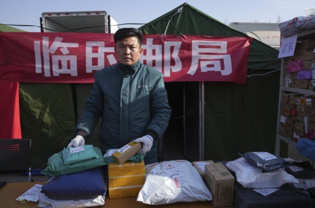 12月21日,赵玉山在大河村安置点的临时邮局内清点快递。新华社记者陈斌摄