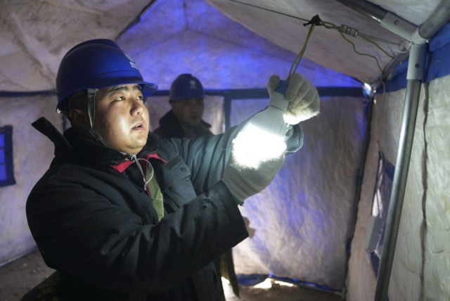 12月21日,方小平(前)和同事在为新搭建的帐篷通电。新华社记者陈斌摄