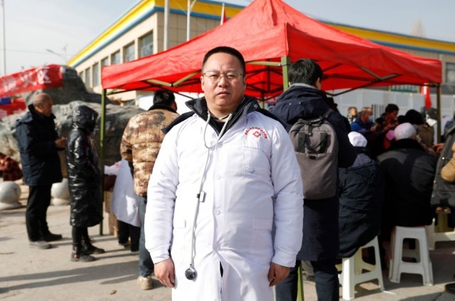 12月21日,39岁的积石山县中西医结合医院医生陶希明在受灾群众临时安置点的医疗救治处。震后,陶希明参与地震伤员转移和救治工作。21日,他来到积石山县大河家镇大河村安置点,为受灾群众接诊及配发药物。新华社记者方欣摄