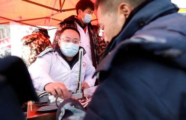 12月21日,陶希明(右三)在为受灾群众量血压。新华社记者方欣摄