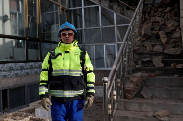 12月21日,王楠在积石山县大河家镇大河村帮助一户受灾严重的群众安全转移家中财物。新华社记者方欣摄