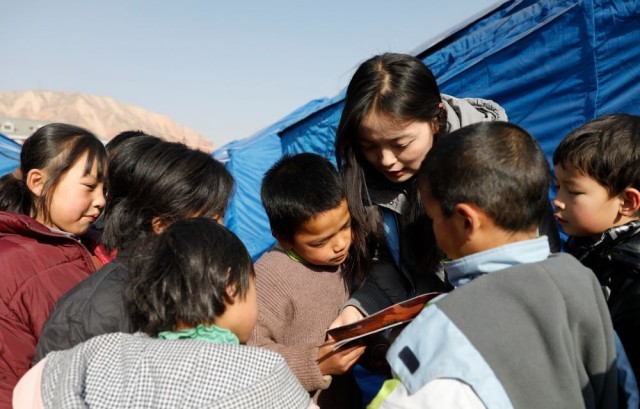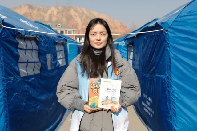 12月21日,25岁的志愿者马向花在受灾群众临时安置点的帐篷外。21日,马向花一早赶到积石山县大河家镇大河村安置点后,便开始在餐食点、物资发放处维持秩序,陪小朋友们阅读、做游戏。新华社记者方欣摄