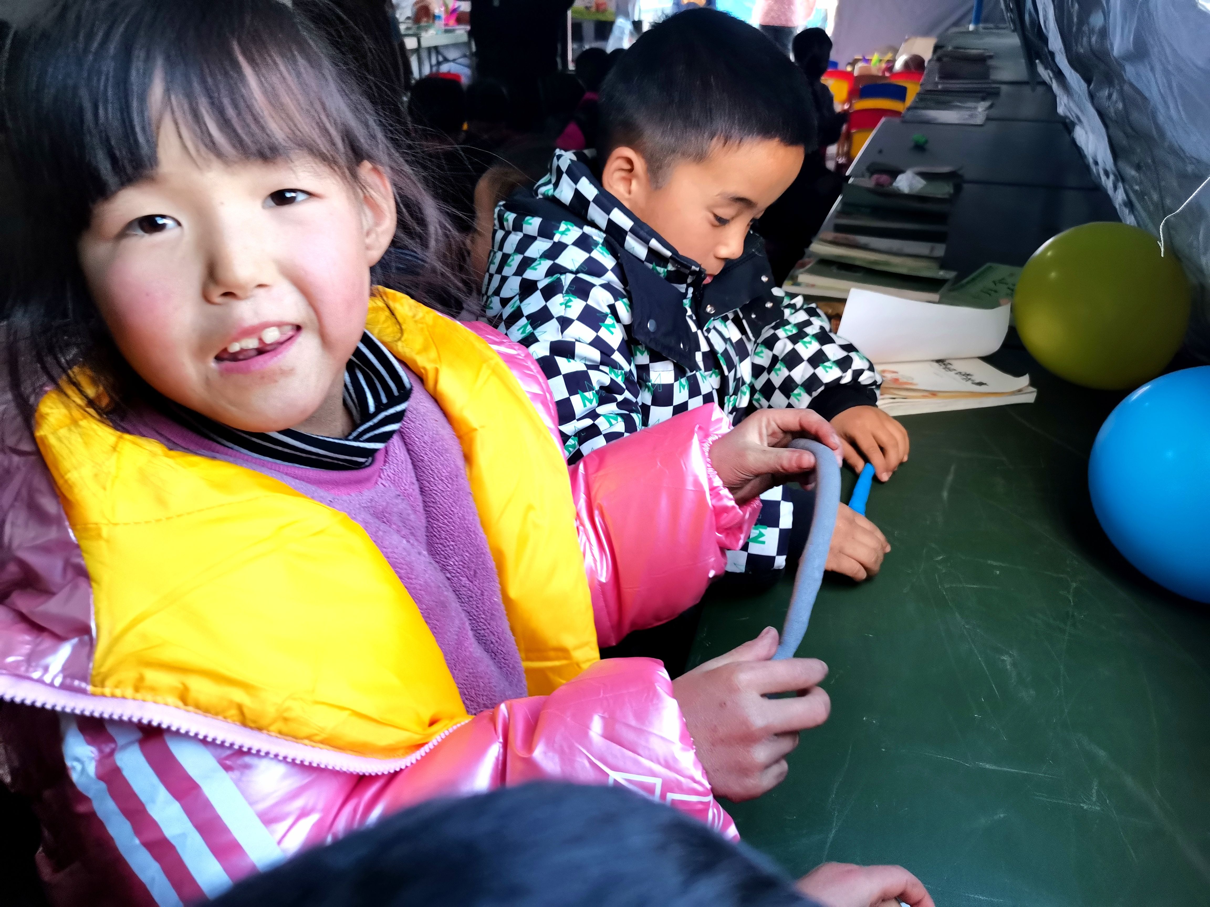 在积石山县陈家村安置点“童心港湾”儿童家园课堂,孩子们在老师的引导下一起做游戏。