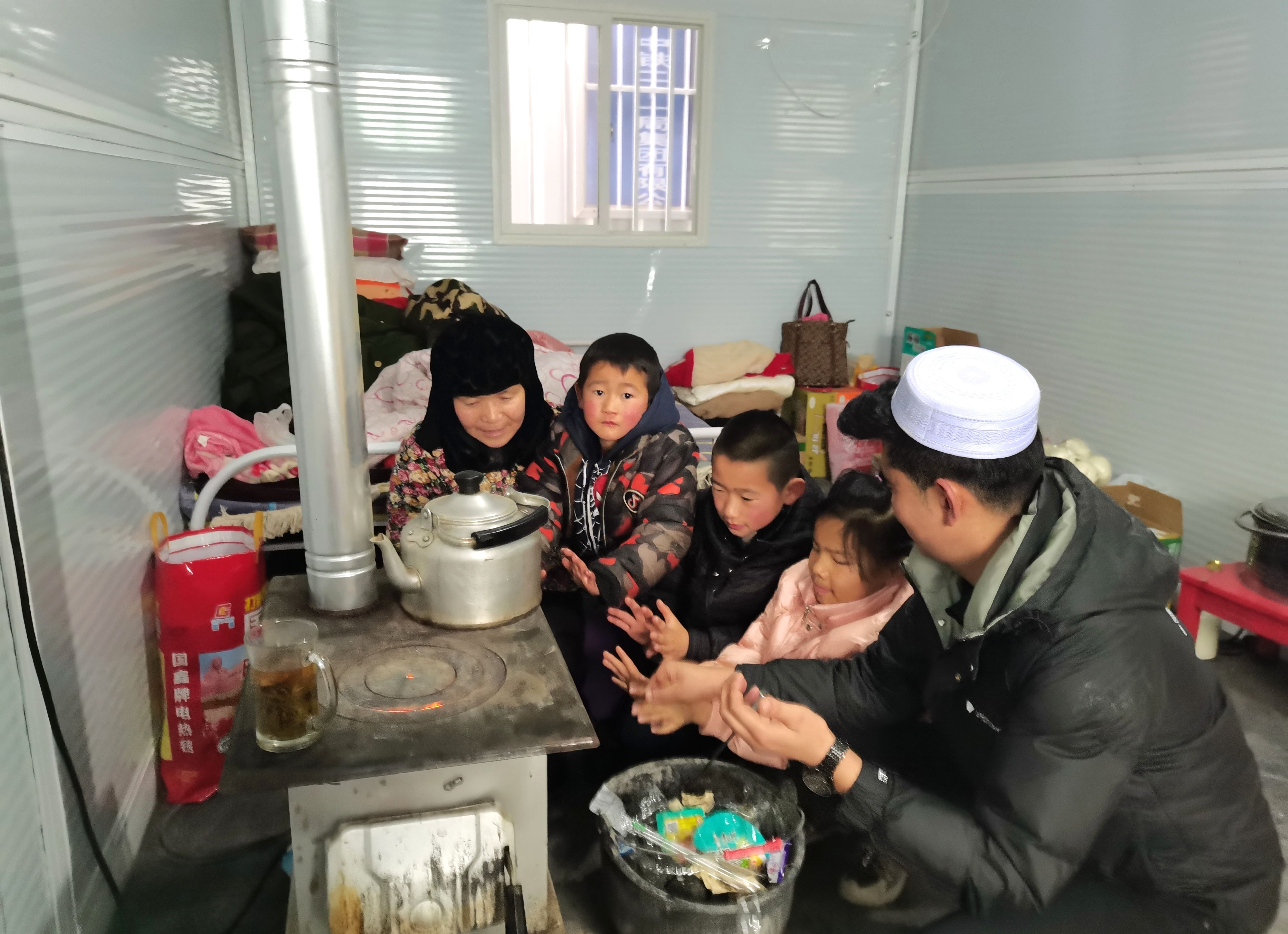 积石山县大河家镇梅坡村广场安置点,地震3天后,马学智一家住进了活动板房。屋外寒气袭人,屋里暖意融融,一家人围在一起烤火炉。