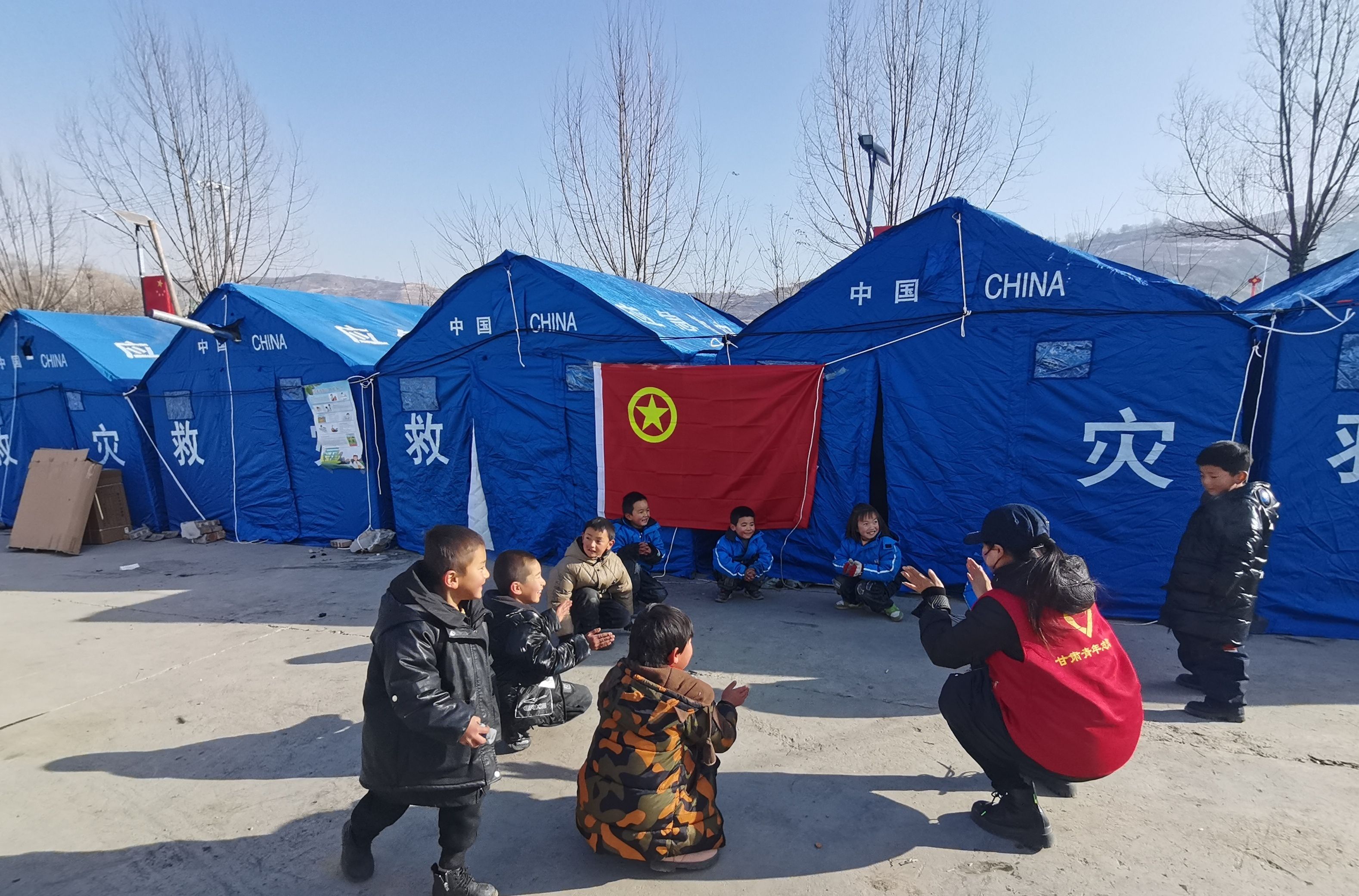 在积石山县刘集乡高李村安置点共青团日间照护中心,志愿者和孩子们一起做丢手绢游戏。
