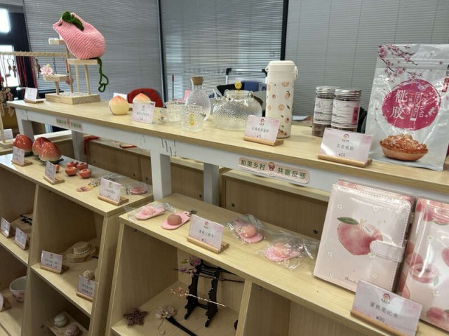 桃胶、蜜桃门禁卡、蜜桃笔记本等三星村水蜜桃相关文创产品在村里售卖。中青报·中青网见习记者 贾骥业/摄