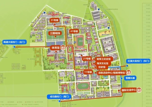 除了雪雕作品学校也绘制了一份游览攻略图包括船舶博物馆、海洋文化馆、军工操场等