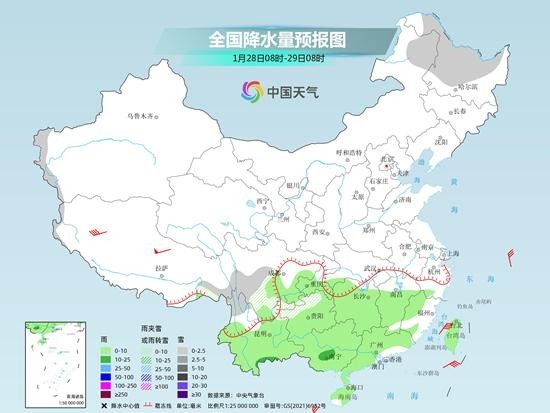 昨天,我国雨雪天气主要出现在西南地区等地。监测显示,27日8时至28日6时,云南、贵州、华南等地出现小雨,云南东部、广西、广东部分地区中雨,云南曲靖、贵州中西部出现雨夹雪,贵州毕节和黔西南局地出现冻雨。