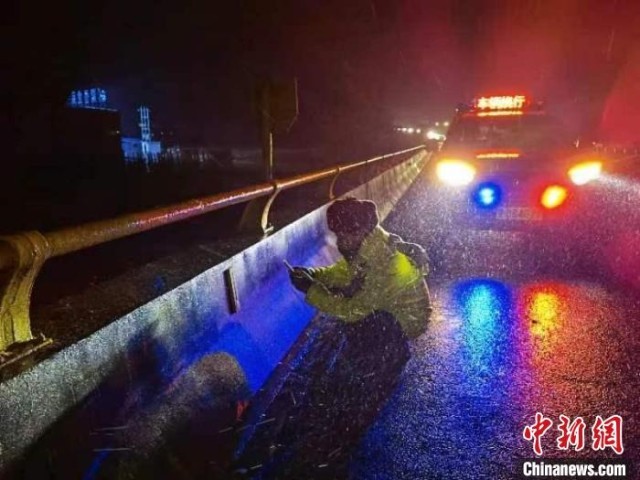 高速交警监利大队民警查看重点桥梁实时温度。湖北高速交警供图