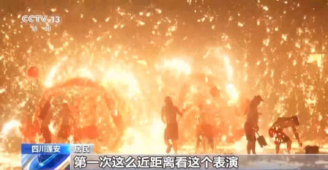 居民:这个效果太精彩了,第一次这么近距离看这个表演。火龙在火花中飞舞,在火花间行走,我太喜欢这个节目了。