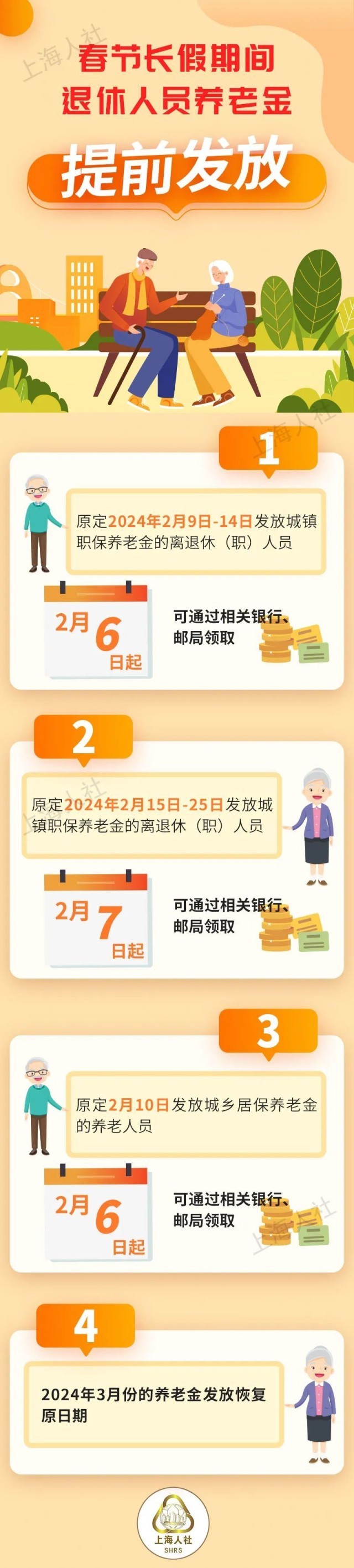 1月31日,上海市人社局发文称,将对春节长假期间发放的离退休(职)人员养老金提前发放,具体安排如下: