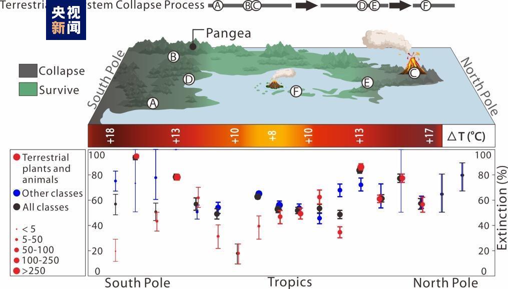 研究人员还根据全球古生物大数据库,对大灭绝前后不同纬度带的生物多样性变化进行了分析。结果显示,低纬度地区不仅生物灭绝发生得较晚,灭绝率也相对较低,这可能说明当时低纬度地区的陆地生态系统具有更高的环境抗压能力。