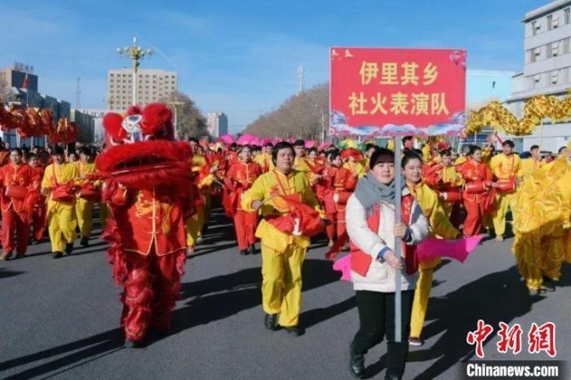 2月12日,农历正月初三,和田市举行2024年“龙腾盛世·春满万家”社火活动,和田市伊里其乡社火表演队巡街。 张亚辉 摄