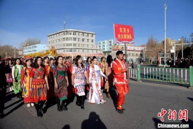 2月12日,农历正月初三,和田市举行2024年“龙腾盛世·春满万家”社火活动。图为和田市吉亚乡社火表演队巡街。张亚辉 摄