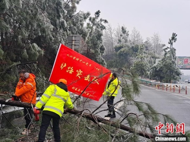 图为江西省交通投资集团九江管理中心组建养护应急救援队伍进行除冰作业。江西省交通投资集团供图