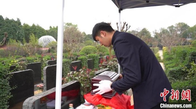 安葬骨灰前,李勤用小扫帚细心打扫墓穴,并在桌子上准备好供品点心和鲜花。随后,他小心翼翼地把骨灰葬入。密封好墓穴后,他庄重地向墓碑鞠躬,送逝者最后一程。青山悠悠,松柏无言,一场安葬仪式在宁静的氛围中结束了。