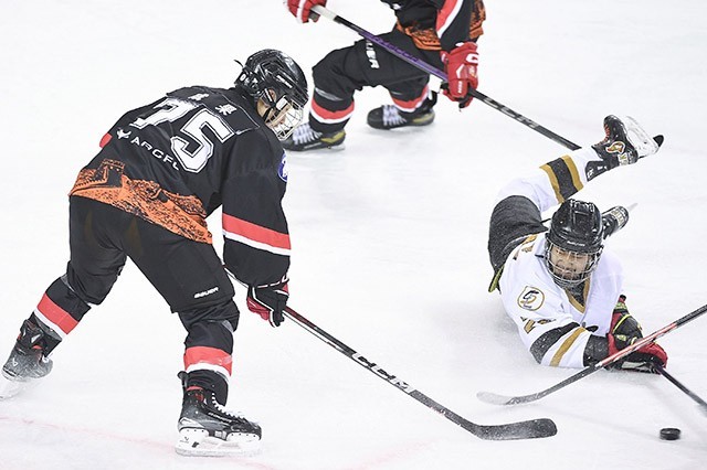 2月20日,第十四届全国冬季运动会冰球项目男子青年组小组循环赛A组比赛中,北京队12比1战胜四川队。北京队球员成果(右)与四川队球员马龙在比赛中拼抢。新华社记者 邓华 摄