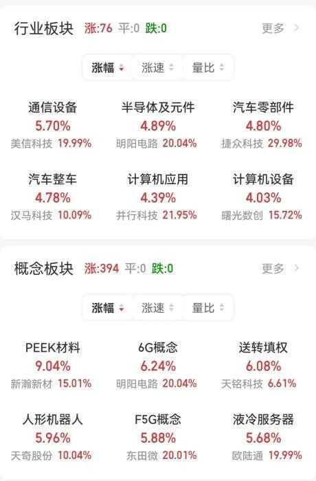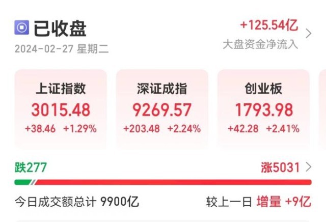 中新网2月27日电 2月27日,A股三大指数集体上涨,截至收盘,沪指涨1.29%报3015.48点,深成指涨2.24%报9269.57点,创业板指涨2.41%报1793.98点。两市超5000只个股上涨,全天成交额9900亿元,北向资金净买入122.49亿元。盘面上,通信设备、半导体及元件、汽车零部件、计算机应用等板块涨幅居前;概念板块方面,PEEK材料、6G概念、送转填权等板块表现亮眼。(中新财经)