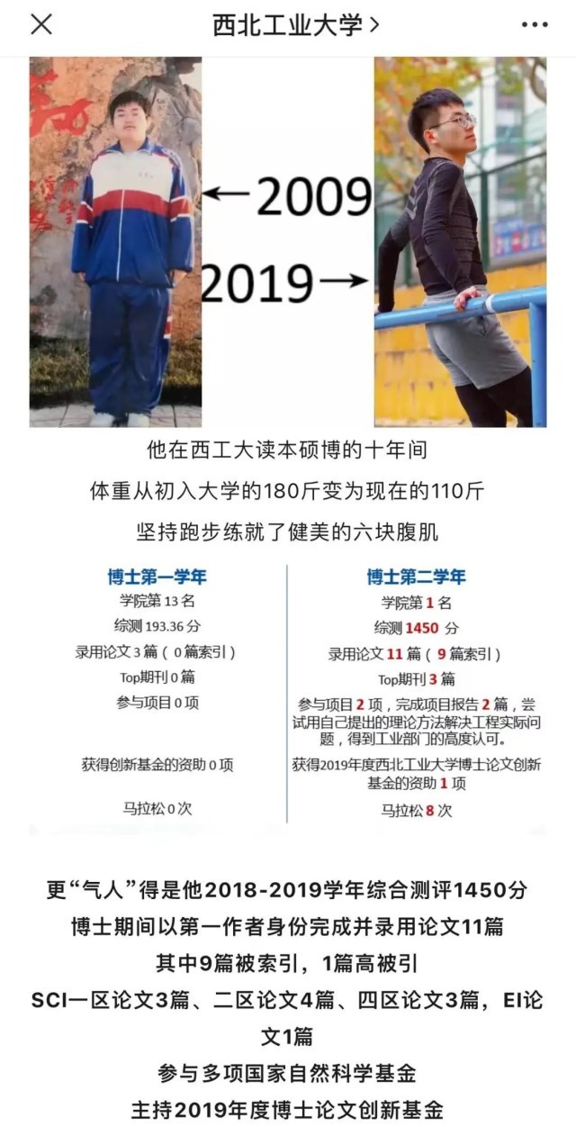 此前,西工大航空学院2017级博士生周易成从180斤减重到110斤的经历,引发关注。他说,“从不敢懈怠,因为不努力就愧对我的导师。”