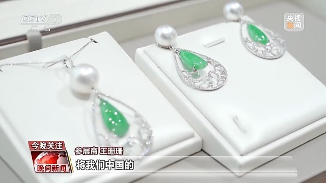 参展商 王珊珊:感受到消费者对于国风的设计非常的喜欢,我们今年推出了几款新品,将翡翠跟珍珠结合,是做了国风的设计,水滴型的设计和流线的祥云将我们中国的东方元素和文化融进去。
