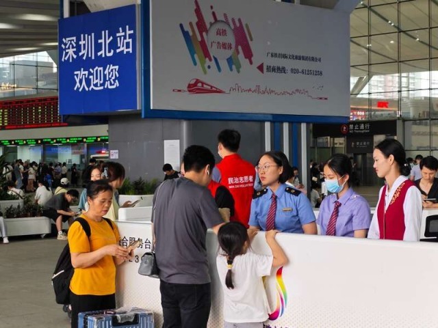 深圳北站工作人员解答旅客问题。岳千琳/摄