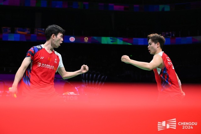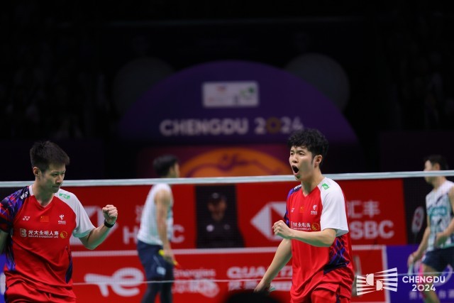中国队第二男双何济霆/任翔宇与马来西亚第二男双吴世飞/努·伊祖丁的比赛也是打的难解难分。何济霆/任翔宇在以18:21先失一局的情况下,关键时刻越战越勇,对手则在压力之下出现崩盘之态。随着何济霆/任翔宇以21:19和21:12连扳两局,他们也以2:1击败对手,帮助中国队以大比分3:1成功晋级到本届汤姆斯杯决赛。此时,整个成都高新体育中心都沸腾了。