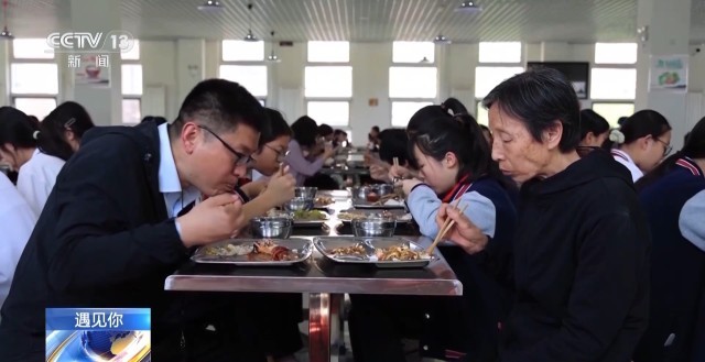 中午12点,孙元金带着母亲来到学校食堂就餐,学校为他们安排了固定的座位。