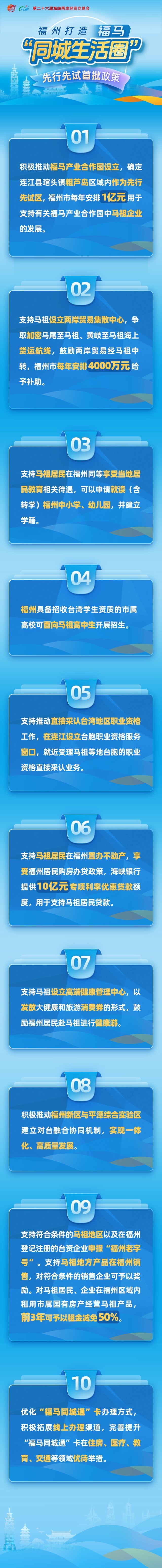 福州-马祖“同城生活圈”10条措施,是福州为贯彻落实《中共中央 国务院关于支持福建探索海峡两岸融合发展新路 建设两岸融合发展示范区的意见》,推动福马“同城生活圈”建设推出的先行先试首批政策措施。