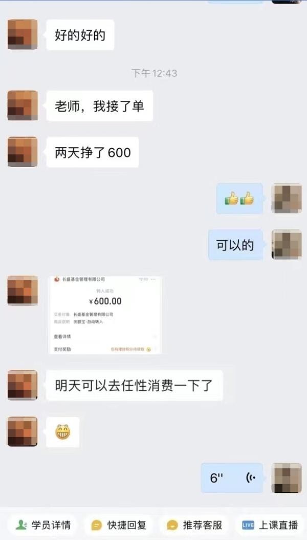 看了客服发来的“成功案例”,显示某初中学历学员在学习完课程后成功接到了大学生毕业设计订单,仅耗时半小时获取报酬420元;某在职老师学员利用周末休息日兼职接单,轻松月入三千,以及所谓的学员“聊天记录”后,邢小姐逐渐打消了顾虑,按照指引支付了100元定金,签署合同约定剩余的4880元分12期支付。