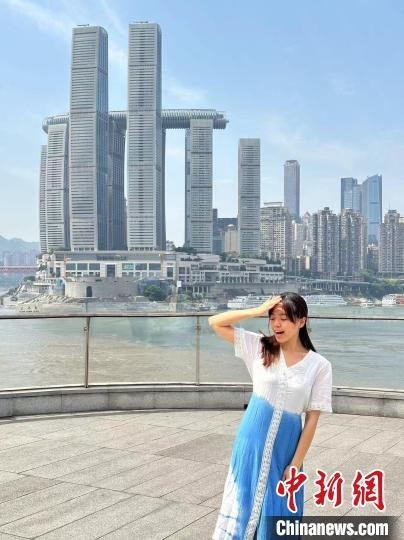 2024年5月,台青林澄仪与重庆地标建筑合影。(受访者供图)