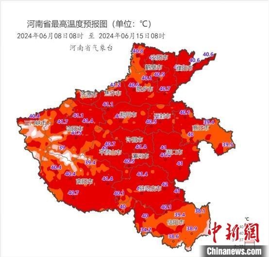 河南省6月8日-14日最高气温预报图。河南省气象局制图