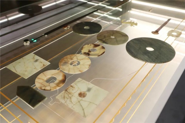 本次“上新”的文物有6件玉璧、2件梯形玉片饰,均出土于刘贺墓主棺内。其中,玉璧分别置于刘贺面部、胸部等位置,大小不等,最大的玉璧直径达到28.3厘米,玉璧装饰纹饰各异,有夔龙纹、凤纹、谷纹等,雕琢精巧,纹饰华美。梯形玉片饰为刘贺镶玉漆枕东、西两侧的装饰物。这组玉器与主棺一同出土的玉琀、玉带钩、韘形玉佩、青铜剑等器物以“复原”的场景化形式组合展示,直观呈现刘贺主棺内陪葬品构成情况,最大程度还原出土“第一现场”。