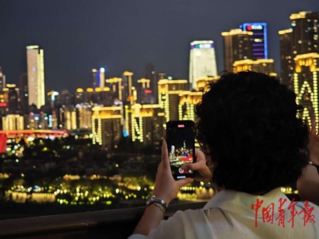 天露在拍摄重庆夜景。中青报·中青网记者 耿学清/摄