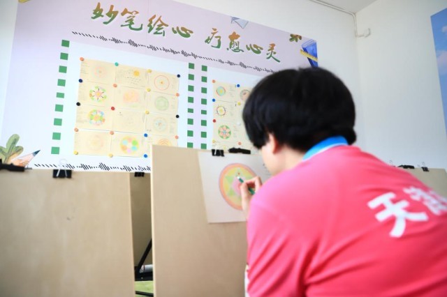小雪在天津市青泊洼强制隔离戒毒所心理矫治中心绘画治疗室进行绘画治疗。新华社发