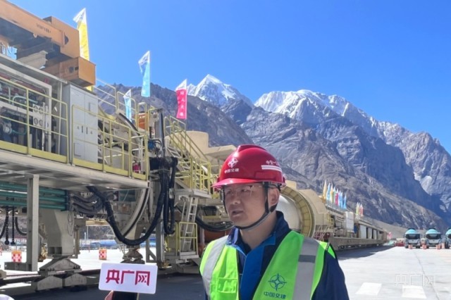邸学军正在介绍隧道采用“主洞(钻爆法)+侧平导(钻爆法+TBM)”的施工方法 (央广网发 姜茸 摄)