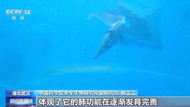 中国科学院水生生物研究所副研究员 郝玉江:刚刚出生的小江豚,最长的潜水时间可能只有二十几秒,现在它基本上和妈妈是同步的,最长的潜水时间可以达到一分半钟,体现了它的肺功能在逐渐发育完善。