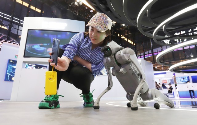 7月2日,北京,在2024全球数字经济大会的数字经济沉浸式体验区,参观者与机器狗合影。