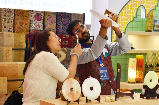 6月18日,河北廊坊,在2024中国·廊坊国际经济贸易洽谈会现场,巴基斯坦商人展示商品。