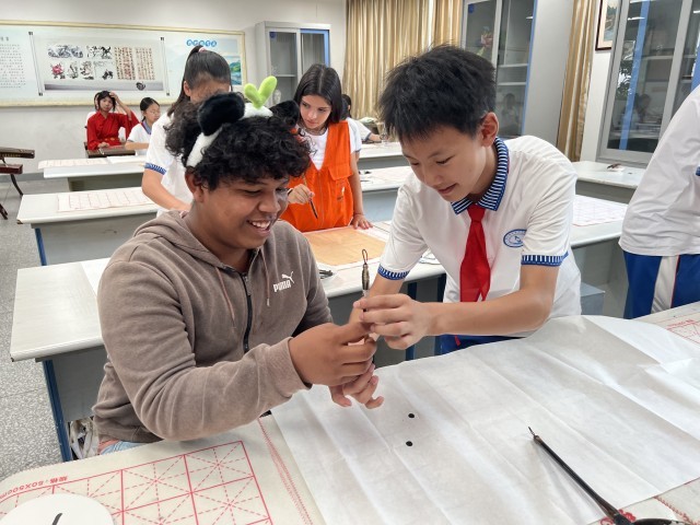 7月13日,四川省都江堰市李冰中学。巴西少年记者在中国学生的指导下学习使用毛笔。中青报·中青网记者 赵安琪/摄