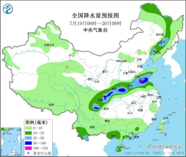 7月19日08时至20日08时,四川盆地北部和西南部、陕西南部、河南西南部和东部、安徽北部、江苏北部、山东南部、广西南部沿海、广东南部沿海、海南西部、云南南部、吉林中部、辽宁中部等地部分地区有大到暴雨,其中,四川盆地北部和西南部以及山东南部等地局地有大暴雨(100~150毫米)(见图4)。