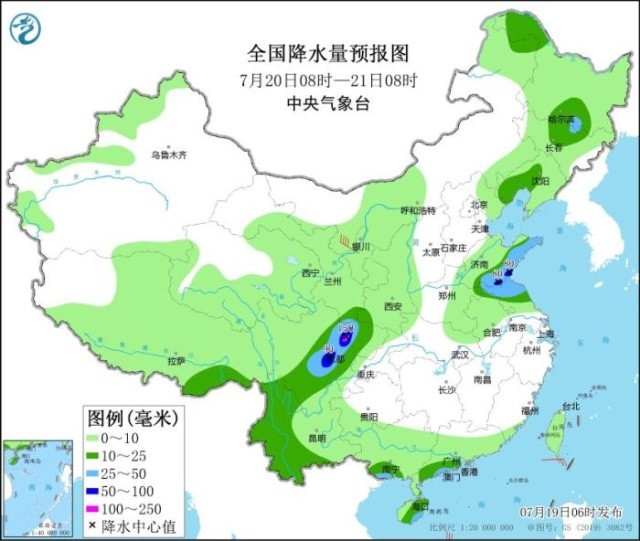 图4 全国降水量预报图(7月19日08时-20日08时)