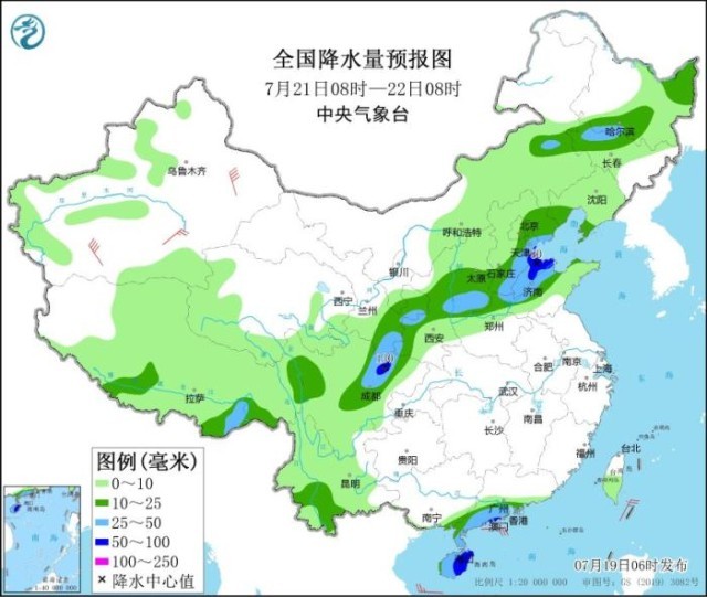 图6 全国降水量预报图(7月21日08时-22日08时)