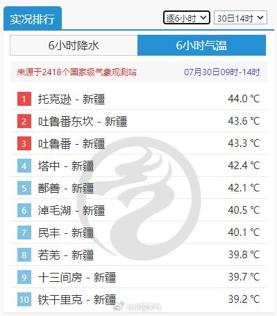 在大陆高压和伊朗高压控制下,新疆的高温太猛了!截至今天14时,高温排行榜被新疆站点“霸榜”,托克逊达到了44℃。托克逊预报了今天了最高气温48℃,当地最高气温纪录是48.8℃,现在还没有到最热的时候,是否会冲击纪录?