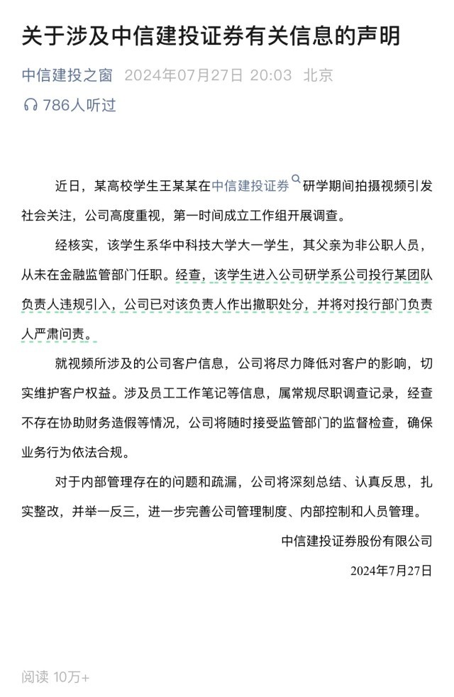 视频发布后,中信建投迅速作出回应称,视频内容涉及该司客户敏感信息,违反了其合规管理规定。公司已责令该学生终止研学,并按照相关规定对有关责任人启动问责程序。