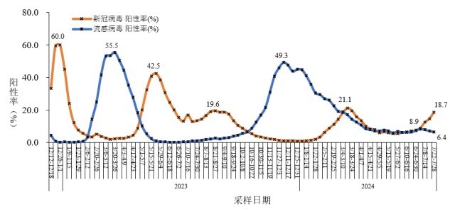 全国哨点医院流感样病例新冠和流感病毒阳性率变化趋势。图片来源:中国疾控中心官网