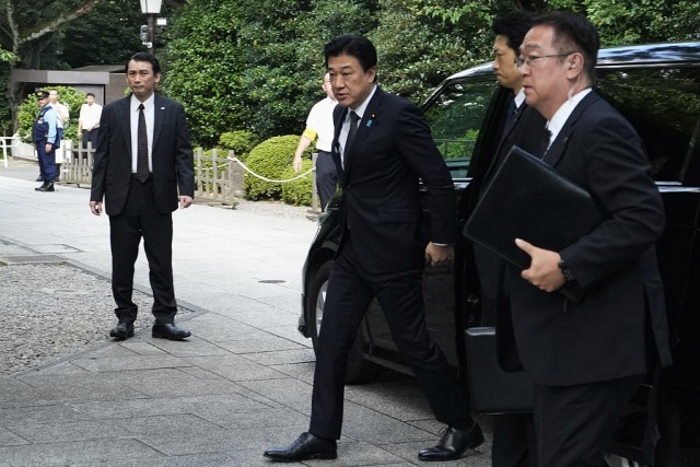 8月15日,日本东京,日本防卫大臣木原稔(右三)抵达靖国神社。视觉中国供图