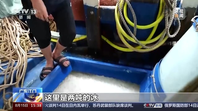 渔民 张先生:这里是两吨的冰,到时候用来冰虾可以冰50担(5000斤)左右。油、冰要提前两三天加好,网昨天也整理好了,现在就等8月16日开渔。