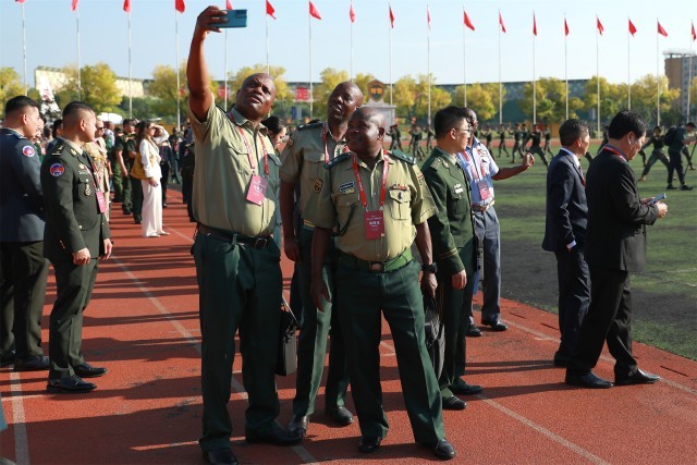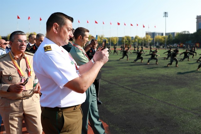 外方参会代表观摩武警特警学院学员训练,并拍照留念。中青报·中青网记者 王裴楠/摄